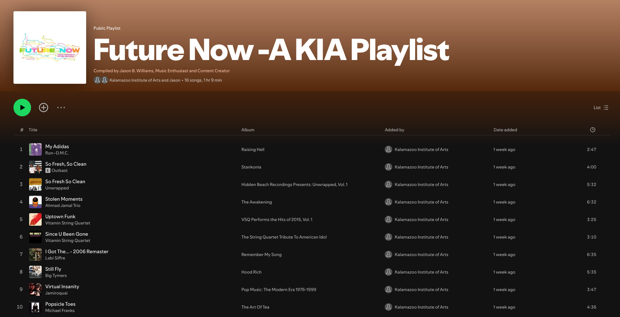 Listen to the KIA Playlist on SpotifyKIA Playlist Liner Notes:The artists featured in the Future Now playlist span decades, genres, and cultural movements, mirroring the evolution of footwear from practical necessity to design centered brands to athletic innovation to global fashion icons. From trailblazers who defined early Hip-Hop’s pulse to modern producers shaping the sound of the future, each artist represents a moment in time where music—like sneakers—signaled identity, aspiration, and reinvention. The music artists create reflects changing technologies and tastes, the evolution of creative expression, and the belief that music is a universal language. Whether rooted in the basslines of Jazz, or the raw storytelling of Hip-Hop, the experimental edge of Electronic & House music, or the genre-blending aesthetics of contemporary pop and R&B, these artists collectively form a sonic timeline that parallels the themes in Future Now: Virtual Sneakers to Cutting Edge Kicks. Just as sneakers have transformed from everyday footwear into symbols of culture, performance, and style, these musicians push boundaries, remix traditions, and shape new artistic frontiers. Together, they create a soundtrack that celebrates movement, innovation, and the ever-evolving rhythm of modern life.-Jason B. Williams, Music Enthusiast and Content Creator
